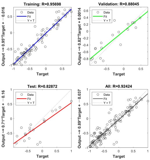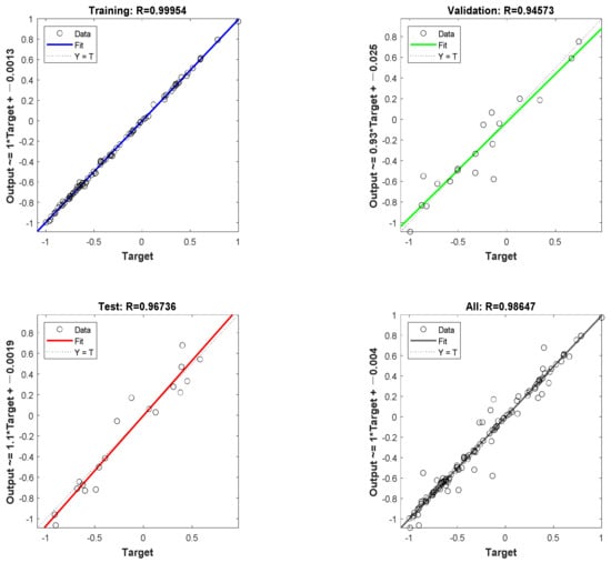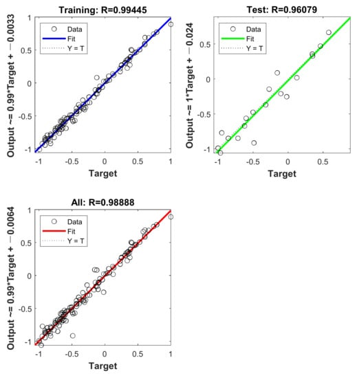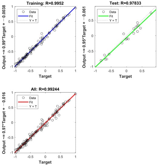 The AO-BR model is depicted in Figure 12. The goodness of fit of the BR-ANN was R = 0.9952 for the training set, R = 0.97833 for the test set and R = 0.99244 for the overall model, as shown in Figure 12.