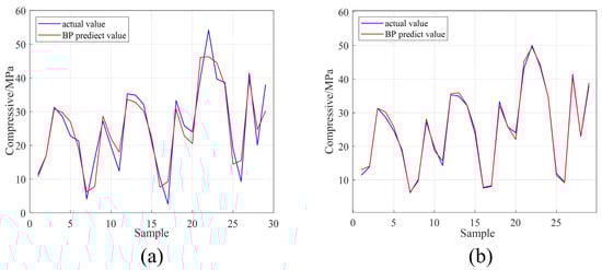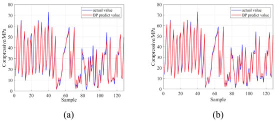 Figure 10a,b shows the true values and model predictions in the P-BR and AO-BR training sets. The error between the true and predicted values in the training set was used to indicate the goodness of the model: when the higher degree of overlap between the true and the predicted data represented the smaller error between the true and the predicted values, the model of the neural network was better. Figure 10 shows that, after hyperparameter optimization, the degree of overlap between the true and the predicted values of the training set data further increased. Table 10 shows the three evaluations metrics for the P-BR and AO-BR training sets. Table 10 shows that, after hyperparameter optimization, although the MSE and MAE changed from 7.1374 and 1.7552 to 9.3144 and 2.0017, respectively, with a small increase, the final R-value increased from 0.9889 to 0.9924, indicating that the final impact of hyperparameter optimization on the accuracy of the model training set was positive. When we combine Figure 10 and Table 10, it is evident that after hyperparameter optimization, the training set of the neural network model achieves a better fitting effect.