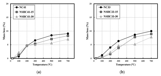 - Mass loss decreased as temperature increased, whereas NSH replacement increased. Significant differences were observed at temperatures above 500 °C, with NSHC41-15 demonstrating a higher mass loss of approximately 26% compared to NSHC41-30, and NSHC33-15 demonstrated a higher mass loss of approximately 51% compared to NSHC33-30.