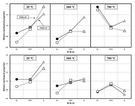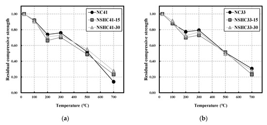 - The residual compressive strength of NSHC41-15 and NSHC41-30 at 700 °C was 0.23 and 0.28, respectively, which is higher than that of NC41; all specimens with W/B 33 showed similar residual compressive strength. This is believed to be the effect of the formation of aggregated structures according to the increase in cohesion following the evaporation of water on the surface of the NSH and the slight sintering of clay minerals.