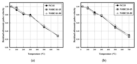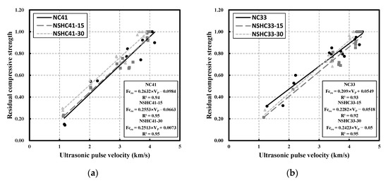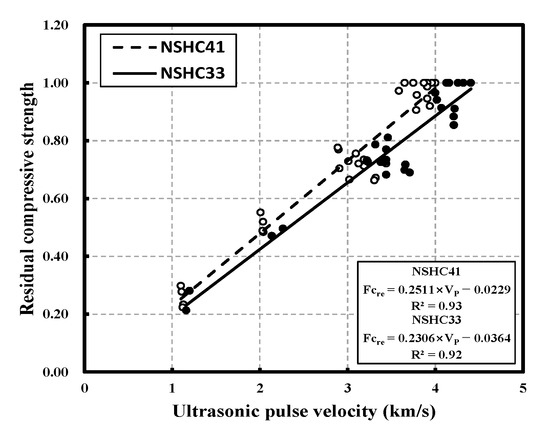- The analysis of the correlation between residual compressive strength and UPV following high-temperature exposure revealed that for W/B 41, NC41 and NSHC41-15 showed a similar trend, but NSHC41-30 had an approximately 16% higher value than the other two specimens. In the case of W/B 33, as the temperature increased, NC33 showed values higher than those of NSHC33-15 and NSHC33-30 by approximately 21% and 12%, respectively. Finally, following high-temperature exposure of NSHC, an equation for predicting compressive strength was proposed by W/B using UPV analysis. For NSHC41 and NSHC33, the correlation between residual compressive strength and UPV was strong, with the following correlation coefficients (R2): 0.93 and 0.92, respectively.