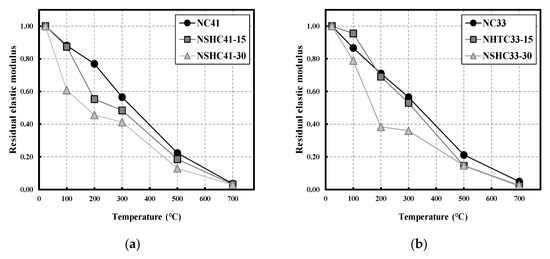 - The residual modulus of elasticity for NSHC41-30 at 100 °C was 0.61 and 0.38 for NSHC33-30 at 200 °C. Therefore, the modulus of elasticity showed a significant decrease with increasing NSH replacement, and with rising temperature, it also decreased with increasing NSH replacement.