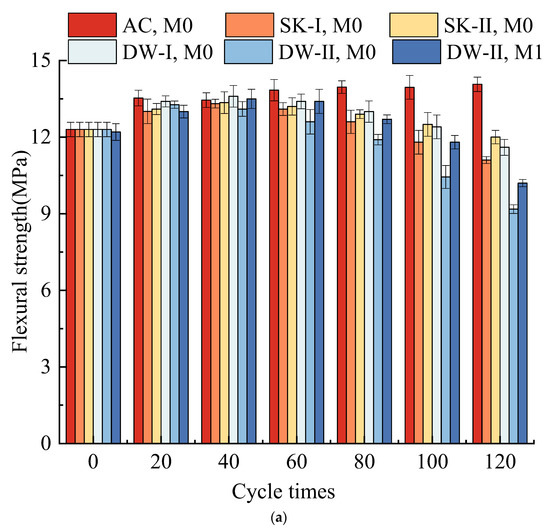 Figure 1 depicts the development of flexural strength and compressive strength in the MKPC paste under different corrosive environments. As shown in Figure 1, the flexural strength and compressive strength of both M0 and M1 increased first to a peak and then decreased as the erosion grew in the four corrosion conditions, while they increased continuously under air curing. After 40 dry–wet cycles, both M0 and M1 showed a higher compressive strength than the air-cured samples, possibly due to better paste hydration resulting from corrosion-induced water adsorption [13,18,36]. The M0 paste subjected to the DW environment at first had a higher strength than the MKPC specimen subjected to the SK environment under the same hydration time. After 120 dry–wet cycles, the final strengths of the samples were in the order AC, M0 > SK-II, M0 > DW-I, M0 > SK-I, M0 > DW-II, M1 > DW-II, M0. The flexural strength and compressive strength of M0 exposed to the SK-II environment were 12 MPa and 63.5 MPa, the highest among those of all the specimens except for that of the air-cured samples. In contrast, the M0 paste exposed to the DW-II environment had the lowest strength. This indicated that wet–dry cycling appeared to be beneficial for improving the water resistance of MKPC, but detrimental for its sulfate resistance. During sulfate attack, the M1 paste reached the peak strength after 40 dry–wet cycles, while the M0 paste reached the peak strength after 20 dry–wet cycles, and the peak strength of the M1 paste was greater than that of the M0 paste. Under the DW-II environmental conditions, this could be explained by a more dense structure and a reduction in the dissolution of hydration products due to the addition of waterglass, resulting in an increase in the flexural and compressive strength and durability of MKPC.