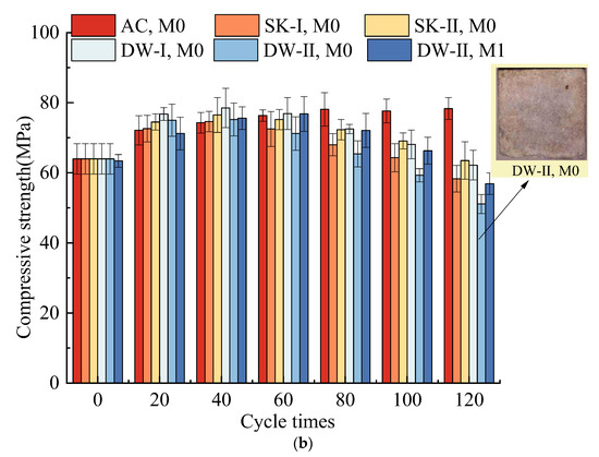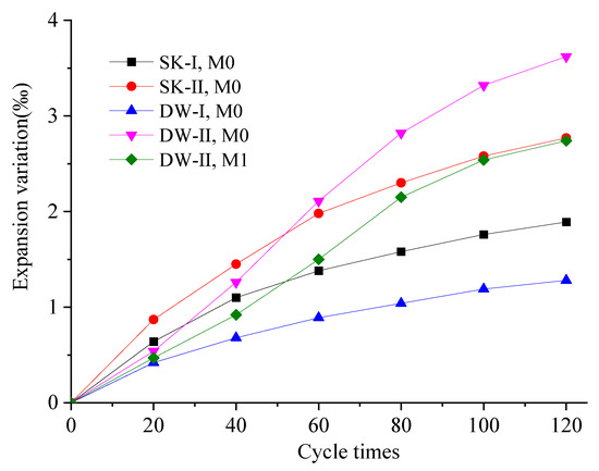 Figure 3 shows the evolution of the deformation of the MKPC specimens exposed to the four corrosive environments. All specimens exhibited expansion deformation, and the value increased as the number of dry–wet cycles increased. This can be attributed to the increased degree of hydration in environments with excess liquid phase [36]. Furthermore, the unreacted MgO and H2O formed Mg(OH)2, resulting in volume expansion [10,38]. Typically, M0 exhibited an expansion deformation pattern consistent with its corrosion age, except in DW-II corrosion conditions. The specimens swelled rapidly within 60 dry–wet cycle, and the expansion rate was moderate. Compared to M0 cured under SK-II environments, the expansion of M0 under DW-II conditions was significantly lower when the number of dry–wet cycles was limited to 40. The expansion tended to be more pronounced when the number of dry–wet cycles exceeded 80. Initially, the MKPC specimens subjected to dry–wet cycling were significantly less deformed than the MKPC specimens soaked in water or the sulfate solution. This can be explained by the fact that the MKPC specimens soaked in the corrosion solution were always water-saturated, while those subjected to the dry–wet cycles were in a drying state, which means they would not undergo deformation due to crystal expansion as a result of water absorption. A further increase in the number of the dry–wet cycles would result in an expansion of the MKPC specimen. This can be attributed to the crystallization pressure of salt resulting from the water-saturated crystallization of the sulfate salt during drying, as well as the newly formed hydrated product (MKP) and the newly generated sulfate-containing phases. The volume expansion rate of M0 soaked in the 5% Na2SO4 solution was much higher than that of M0 soaked in water throughout the whole process. This can be attributed to the formation of new sulfate-containing crystals such as MgK2(SO4)2·6H2O [19]. After 120 dry–wet cycles, the volume expansion rates were in the order DW-II, M0 (3.62‰) > SK-II, M0 (2.77‰) > DW-II, M1 (2.73‰) > SK-I, M0 (1.89‰) > DW-I, M0 (1.28‰).
