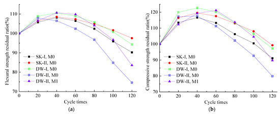 Figure 2 shows the strength retention coefficient of the MKPC paste under various corrosive conditions. Compared to the initial strength, the strength retention coefficient of the M0 paste under different corrosive environments increased first and reached a peak value at 60 dry–wet cycles. The strength residual rate of the specimens (M0) soaked in water and 5% Na2SO4 was 106.5% and 107.3% (flexural strength) and 113.3% and 117.5% (compressive strength). The strength residual rate of the specimens after 60 dry–wet cycles in water and 5% Na2SO4 was 108.9% and 102.4% (flexural strength) and 120.2% and 113.4% (compressive strength). After 120 dry–wet cycles, the strength residual rate of the specimens (M0) when soaked in water and 5% Na2SO4 was 90.2% and 97.56% (flexural strength) and 91.1% and 99.2% (compressive strength), the strength residual rate of the specimens after 120 dry–wet cycles in water and 5% Na2SO4 was 94.3% and 74.6% (flexural strength) and 97.2% and 79.9% (compressive strength). M0 soaked in the sulfate solution exhibited significantly better corrosion resistance than after soaking in water. It appears that M0 had a higher resistance to sulfate corrosion than to water corrosion, as previously reported [18]. However, the M0 paste under dry–wet cycles in the 5% Na2SO4 solution presented the lowest strength retention ratio in the whole corrosion test when the strength started to drop. This indicates that dry–wet damage was dominant when the samples were exposed to the combined action of sulfate attack and wet–dry cycling.