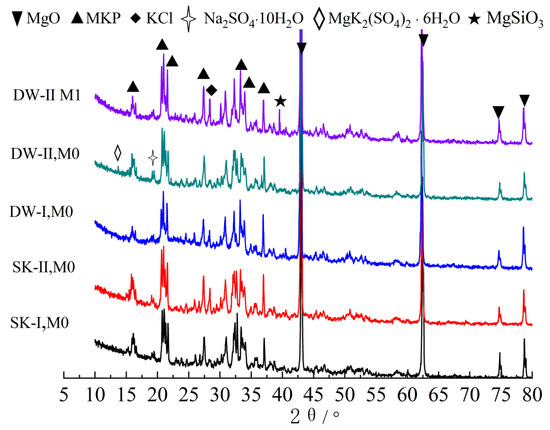 As one of the most widely used construction materials, concrete is increasingly being used in difficult environments such as salt lakes, salty soil, collapsible soil, as well as in maritime engineering [1]. However, the concrete structures used under such conditions suffer severely from long-term corrosion caused by sulfate attack, which severely affects the normal performance of buildings [2,3,4]. Furthermore, differences in river and groundwater levels with the changes in season, as well as the splash zone, result in dry–wet cycles. Sulfates have a more severe effect on concrete structures when combined with wet–dry cycles. The combined effects of wet–dry cycles and sulfate pose a greater risk of damage to concrete structures. Magnesium phosphate cement (MPC) has been promoted for the rapid repair of concrete structures in various corrosive environments in order to extend their service life [5]. MPCs have excellent properties as compared to other cementitious materials, such as enhanced adaptability to environmental temperature, fast hardening, high early strength, low shrinkage, better adhesion, etc. [6,7,8,9,10,11].