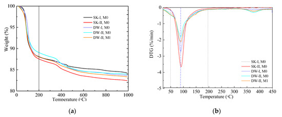 Figure 5 exhibits the TG-DTG curves of MKPC after 360 days of immersion and 120 dry–wet cycles in water and the 5% Na2SO4 solution. At about 100 °C, the DTG curve illustrates a significant loss of mass due to the loss of crystalline water [39,40]. Moreover, an additional peak between 350–400 °C was observed when the MKPC paste was subjected to 120 dry–wet cycles in 5% Na2SO4, which could be due to the dehydration of the new sulfate-containing crystals; further study will be needed. Below 200 °C, the percentages of mass loss of the MPPC specimens were as follows: SK-II, M0 (11.56%) > DW-I, M0 (11.48%) > SK-I, M0 (11.43%) > DW-II, M1 (10.91%) > DW-II, M0 (9.92%). In the same corrosion conditions, the total mass loss below 200 °C in the M1 sample was obviously larger than that in M0, which confirmed that the hydrolysis and loss of MKP in M1 were more limited than that in M0, but the little mass loss at 300–400 °C in M1 was obviously less than that in M0.The lowest quantities of the hydration product MKP in the M0 samples cured under the DW-II environment indicated that hydrolysis and loss of MKP were enhanced due to the deterioration of the pore structure caused by the crystallization pressure of the salt, justifying the strength test results during this process.