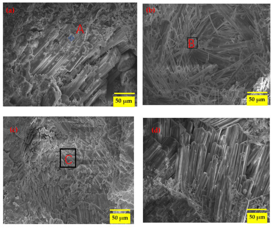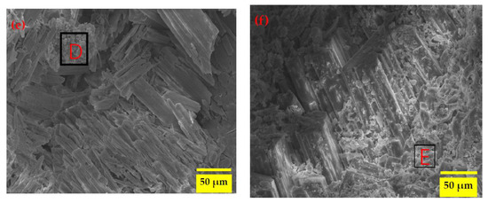 Figure 6a–f shows the microstructure of the MKPC samples after 12 months of exposure to the SK and DW environments in water and sulfate solution. The EDS results are shown in Table 4. When the MKPC paste was exposed to the SK environment in water (Figure 6a), good columnar crystals appeared tightly packed together in an orderly manner. These crystals (area A) were verified as MKP on the basis of a molar ratio of Mg/P/K of approximately one. Some Na and CI elements were also detected in area B, probably derived from the composite retarder. In the M0 sample exposed to the SK-II environment, distinct morphologies such as rod-like and needle-like crystals of hydrates were observed (Figure 6b,c); these hydrates may be the products of struvite-K dissolution and precipitation. As shown in Table 4, the components of Area C were O, Mg, P, K, Na, CI, and S elements, with a molar ratio of P to K of approximately 1:1. Based on the results of XRD, these elements should be derived from the hydration products and the remaining magnesium oxide. Among them, the presence of the S element confirmed that a sulfate-containing phase was mixed with the hydration products. On the fracture surface of the M0 sample subjected to the DW-I environment (Figure 6d), well-formed and randomly oriented rod-like crystals shown to be MKP by the EDS results were observed. The crystal surface was smooth without visible corrosion marks. The combination of the hydration products such as MKP and the remaining MgO made the microstructure dense, which could also explain the good compressive strength and deformation stability. After 120 dry–wet cycles in the sulphate solution, the microstructure showed in Figure 6e of the M0 samples was very loose, more large rod-like crystals were observed—some of them broken—and many amorphous phases were distributed among the crystals and adhered to their surfaces, indicating the dissolution of the hydration products in the MKPC past with the formation of pores [13]. Based on the high S content in area D, it was evident that SO42− was involved in the hydration reaction, which resulted in new hydration products. The generation of Mg(OH)2 occurred as MgO reacted with H2O, resulting in a high internal stress that promoted the formation of intrinsic microcracks, further resulting in the decrease of strength and volume stability. These results are also in accordance to the XRD and TG-DTG results presented in Section 3.3 and Section 3.4.