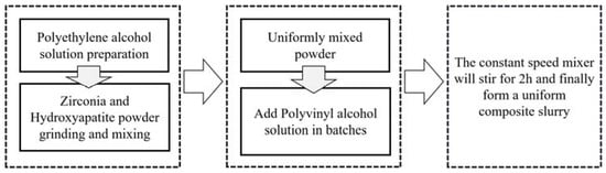 The solid phase content in the composite slurry has a great impact on the molding quality. When the solid phase content in the composite slurry is too high, the slurry’s viscosity is too great, and the extrusion process is prone to clogging the nozzle and causing breakage; when the content is too low, the composite slurry’s viscosity is too low to maintain a certain shape. This paper uses the PVA1788 type polyvinyl alcohol (purchased from Aladdin, Shanghai, China). After a large number of experiments measuring PVA1788 type polyvinyl alcohol in a 14% concentration, we know that its viscosity is stable and will not change over time. Therefore, the concentration of polyvinyl alcohol chosen in this paper is 14%. The specific dissolution steps can be shown in Figure 1.
