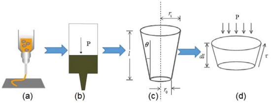 The simplified print head of bioplotter: (a) Extrusion process of composite materials; (b) Simplified model of composite extrusion process; (c) Print nozzle end model; (d) Shear force unit model of printing nozzle.