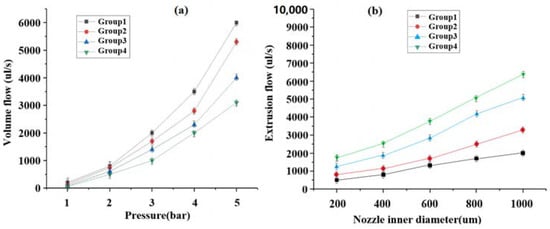 The air pressure values were set to 1 bar, 2 bar, 3 bar, 4 bar, and 5 bar, and the extrusion flow rates at different pressures were shown in Figure 5a. The nozzle diameters were set to 200 µm, 400 µm, 600 µm, 800 µm, and 1000 µm, and the extrusion flow rates for the different inner diameters are plotted as shown in Figure 5b.