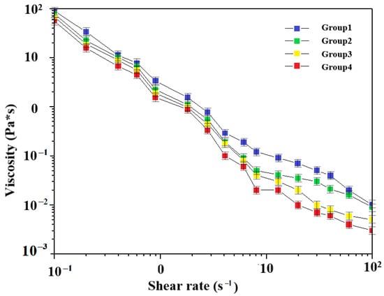 The viscosity of the composite slurry made under different shear rates was measured using a viscometer for each group of ratios, and the viscosity characteristics of the composite slurry made under different ratios are shown in Figure 6.