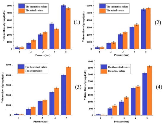 Results for extruded material flow rate at different air pressures: (1) Theoretical value and actual measured value of flow rate of group1 of materials under different pressures; (2) Theoretical value and actual measured value of flow rate of group2 of mate-rials under different pressures; (3) Theoretical value and actual measured value of flow rate of group3 of materials under different pressures; (4) Theoretical value and actual measured value of flow rate of group4 of materials under different pressures.