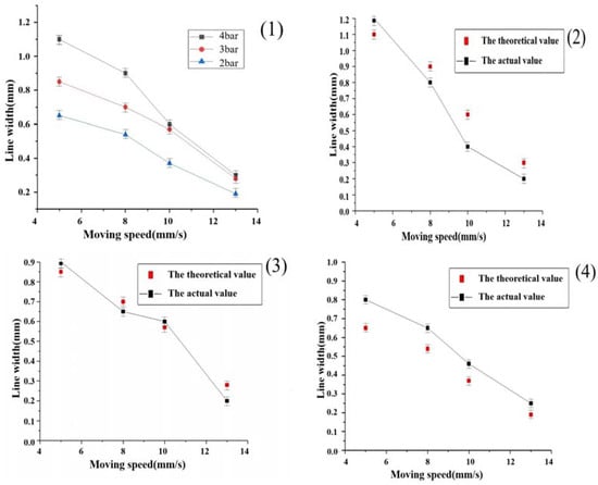 Printhead movement speed on the impact of print line width: (1) different pressure printhead movement speed—line width overall trend graph; (2) 4 bar pressure under theoretical—actual line width comparison graph; (3) 3 bar pressure under theoretical—actual line width comparison graph; (4) 2 bar pressure under theoretical—actual line width comparison graph.