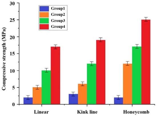 In addition to the physical properties of the material itself, the various internal structures of the artificial bone solids also have different properties that affect the compressive properties of the artificial bone. Before the performance test, in order to further investigate the factors affecting the performance of the artificial bone after molding, the relationship between the internal structure and the mechanical properties was investigated by setting up different internal structures and obtaining the final mechanical property data. In this paper, three different internal structure models were used, as shown in Figure 10. Figure 10a is the linear type, Figure 10b is the bending line type, and Figure 10c is the honeycomb type. Three different internal structures, including the linear type, honeycomb type, and polygonal type, are used for support preparation. The configuration proportion of the composite materials is based on the grouping proportion set in Table 1. The printing nozzle is a cone needle with a diameter of 400 microns. The layer height is set as 0.32 mm, the line spacing is set as 1.1 mm, the moving speed of the nozzle is set as 13 mm/s, and the model size is 10 × 10 × 5 mm. The One-Step sintering (OSS) method was performed by sintering at a target temperature of 1080 °C with a heating rate of 5 °C/min in an air atmosphere using similar heating schemes, and the material was held at the target temperature for 3 h, followed by cooling to 450 °C at a rate of 5 °C/min, and finally cooled to room temperature naturally. The compressive strength of the obtained sample is tested through the electronic universal material testing machine (Universal testing machine, Instron 5566, Shanghai, China), the loading speed is set to 1 mm/min, three experiments are conducted for each group, and the data is taken as the average. The compressive strength is computed using Equation (14) using a universal testing machine operated at a loading speed of 1 mm/min.