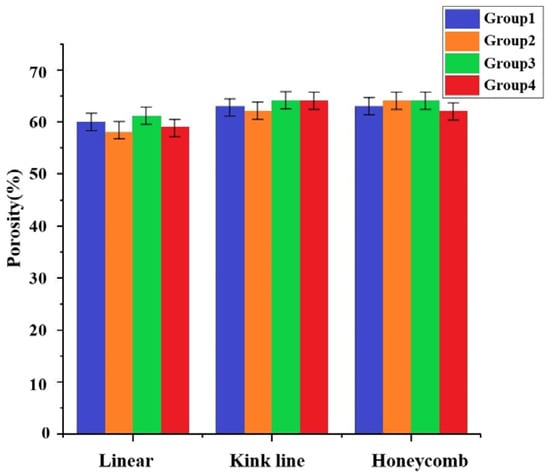 With the increase in ZrO2 content, the elastic modulus of the scaffold obtained different improvement effects, as shown in Figure 12. In the linear type, the elastic modulus of groups 2, 3, and 4 increased by one to five times compared to that of group 1. Different internal structures can obtain different elastic moduli, and the maximum elastic modulus of the honeycomb group can reach 250 MPa. Human bones are divided into cortical and cancellous bones, and different parts have different compressive strengths. The compressive strength of cortical bones generally ranges from 100 MPa to 150 MPa, while the compressive strength of cancellous bones varies from 2 MPa to 20 MPa depending on the density. Therefore, based on the compressive strength alone, the final bone formation in this study can be used as a repair for bone defects in non-load-bearing areas of the human body [39,40]. In clinical applications, different internal structures can be selected to improve the artificial bone performance according to the requirements of different parts of the artificial bone.