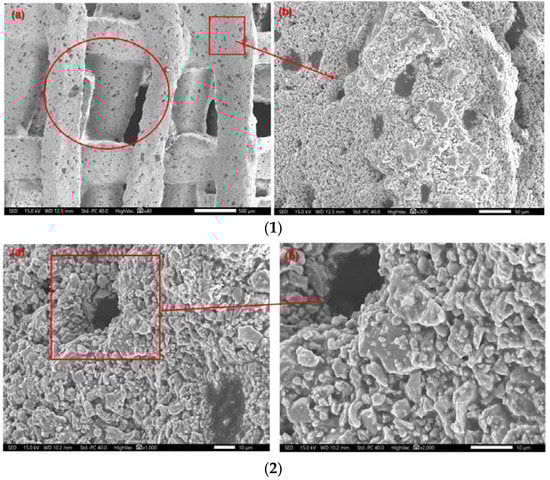 SEM of porous structure of composite scaffolds: (1) Scaffold unit and pore distribution; (2) Pore structure magnification 1000× HA and zirconia distribution maps; (3) Pore structure internal details: (a) SEM result after a magnification of 5000× g; (b) SEM result after a magnification of 10,000× g.