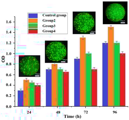 In order to verify the biocompatibility of the composite materials and the influence of the scaffold on cells, c5.18 chondrocytes were used for experimental research. From the data in Figure 15, it can be found that the OD (Optical Density) values of all groups increased with time, indicating that the cell growth condition was better in each group of the experiment. According to the changes in the cytotoxicity rating, it can be found that group 2 and group 3 maintained a cytotoxicity grade of 0 with time, while group 4 decreased to grade 1 after 48 h. Both cytotoxicity grade 0 and grade 1 can be considered qualified. Thus, although the cytotoxicity grade of the fourth group decreased, it was still within the permissible range of compliance. These phenomena also indicate that the increase of ZrO2 content, although improving the mechanical properties of the artificial bone structure, also sacrifices biocompatibility to some extent. The biocompatibility of the three rationing schemes was evaluated comprehensively by cytotoxicity grade evaluation experiments: group 2 (10% ZrO2, cytotoxicity grade 0) > group 3 (20% ZrO2, cytotoxicity grade 0) > group 4 (30% ZrO2, cytotoxicity grade 1). The samples was cultured in a CO2 constant temperature incubator (Shanghai Shenan Medical Equipment, Shanghai, China), After 96 h, the Cell Counting Kit-8 (CCK-8, Dojindo, Kumamoto, Japan) assay was used to count the cells and analyze cell viability. The four groups of cells have grown by more than 100%, and the small picture is the cell fluorescence picture of group 2, which was observed using a Fluorescent inverted microscope (Thermo Fisher, Waltham, MA, USA) and an Enzyme calibrator (Thermo Fisher, Waltham, MA, USA). Nie R. et al. [42] developed a personalized MXene composite hydrogel scaffold GelMA/β-TCP/sodium alginate (Sr2+)/MXene (Ti3C2) (GTAM) with photothermal antibacterial, which play synergistic roles in antibacterial and osteogenic effects. Compared with their results, our composite materials have a higher cell survival rate, which shows that they have better biocompatibility.