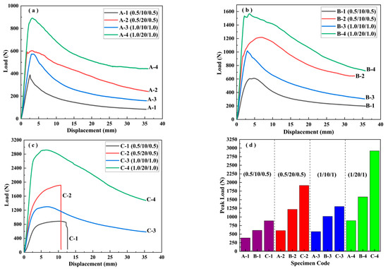 The load–displacement curves of sandwich beams with different core densities under three-point bending: (a) A—52 kg/m3; (b) B—110 kg/m3; (c) C—200 kg/m3; (d) the distribution of the peak load.