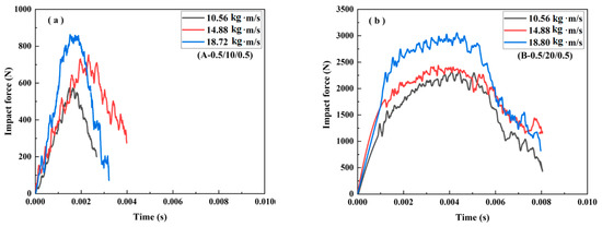 The impact force–time curves of the sandwich beams in Case 3 are shown in Figure 9. The tendency of the curves, as shown in Figure 9, is similar to that shown in Figure 7, and the duration time was also nearly equal, as illustrated by Figure 7. However, the peak impact force values were much larger than those in both Case 1 and Case 2, a trend that we attributed to the increase in the density of the core from 110 kg/m3 to 200 kg/m3.