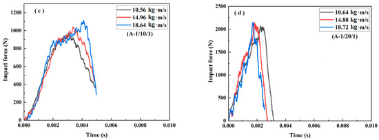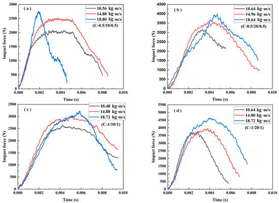 The impact force–time curve of the sandwich beams: (a) C-0.5/10/0.5; (b) C-0.5/20/0.5; (c) C-1.0/10/1.0; (d) C-1.0/20/1.0.