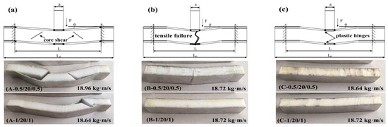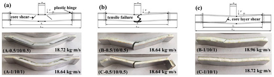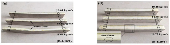 Figure 5 and Figure 6 illustrate the impact force–time curves and the corresponding failure modes of the different sandwich beams under different impact velocities, respectively. The impact velocities of the striker bar were 1.32 m/s, 1.86 m/s, and 2.34 m/s, and the corresponding momentum () was 10.56 kg∙m/s, 14.88 kg∙m/s, and 18.72 kg∙m/s, respectively. Generally, the peak of the impact force increased with the increasing impact velocities for each type of specimen, and for the same face sheet, as shown in Figure 5a,b, the impact force increased with the increases in the thickness of the core. The peak impact force for specimen (A-0.5/20/0.5) was 2 times that of specimen (A-0.5/10/0.5), and a similar relationship was also observed for the specimens with face sheets of 1 mm in thickness: (A-1/20/1) and (A-1/10/1).