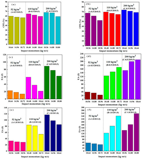 Effects of the impact momentum, density, and thicknesses of the core and face sheet on the crush force efficiency of: (a) (0.5/10/0.5); (b) (0.5/20/0.5); and energy absorption of: (c) (0.5/10/0.5); (d) (0.5/20/0.5); (e) (1.0/10/1.0); (f) (1.0/20/1.0).