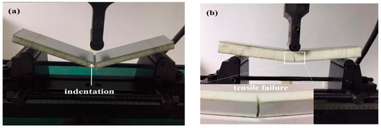 Typical failure modes of the three-point bending tests: (a) indentation failure mode of A-0.5/10/0.5; (b) typical tensile failure mode of C-0.5/10/0.5.