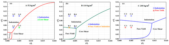 Failure mode maps of the sandwich beams with core densities of: (a) 52 kg/m3; (b) 110 kg/m3; (c) 200 kg/m3.
