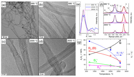 - The use of the 7-peak model for fitting the Raman spectra confirmed the obtained data on the presence of amorphous carbon by an independent TEM method in the heat-treated samples of CB Printex-XE2-B. For the heat-treated MWCNTs, the 7-peak fitting model made it possible to isolate the change in the contribution of D3′ and D3″ modes of amorphous carbon and to determine its correspondence to the structural elements (sp2 fragments on the surface, wall defects and nanotube bends).