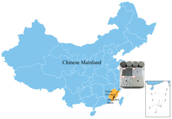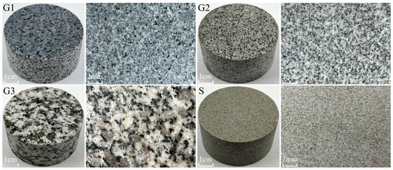 The Zhangzhou Basin in Fujian Province is a prominent hot dry rock geothermal exploration area on China’s eastern coast (Figure 1). Most of the hot dry rock lithologies in the area are granites, with a few sandstones [33]. To simulate hot dry rock realistically, three types of granite and one type of sandstone were collected as the test material, taken from outcrops with the same geological period of the hot dry rock stratum. Different lithologies are apparently distinct in particle size and colour, as shown in Figure 2. G1 and G2 types of granite are in a particle size range of 0.1–1.2 mm and are coloured in dark grey and light grey, respectively. G3 type of granite has a particle size range of 1.0–3 mm and is in grey-white. The sandstone has a particle size in the range of 0.05–0.25 mm and is grey-green. The mineral composition of all lithologies was analyzed using polarised micrographs of rock sections and X-ray diffraction patterns, as shown in Figure 3 and Figure 4. The main minerals in the G1 granite are feldspar (9.34%), mica (42.26%), quartz (18.29%), hornblende (9.18%), pyroxene (17.1%); in the G2 granite, they are feldspar (18.57%), mica (33.72%), quartz (28.02%), hornblende (7.46%), pyroxene (9.25%); in the G3 granite, they are feldspar (19.63%), mica (15.99%), quartz (53.57%), hornblende (8.73%), and in the sandstone they are quartz (79.3%), kaolinite (11.8%), and feldspar (7.4%).