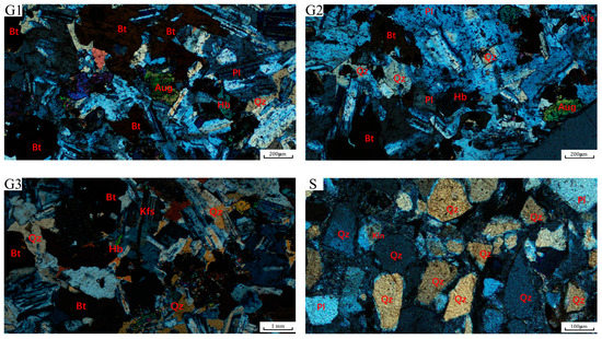 Micrographs of G1, G2, G3, and S lithological specimens by a single-polarization microscope.