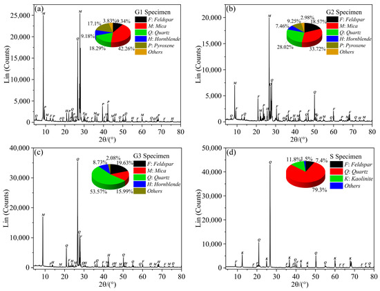 X-ray diffraction (XRD) patterns of rock specimen: (a) G1 specimen; (b) G2 specimen; (c) G3 specimen; (d) S specimen.