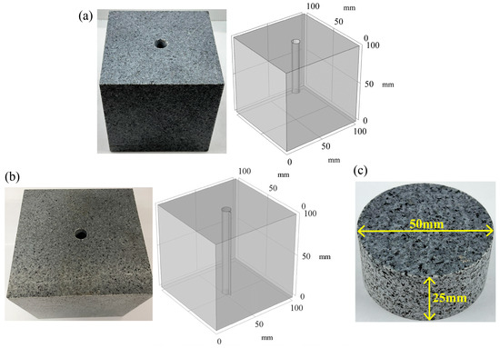 Specimen preparation: (a) HFS specimen for hydraulic fracturing tests; (b) SFS specimen for secondary fracturing tests; (c) BSS specimens for Brazilian splitting tests.