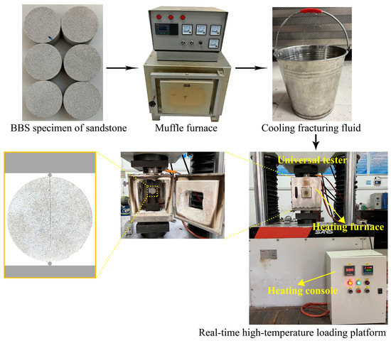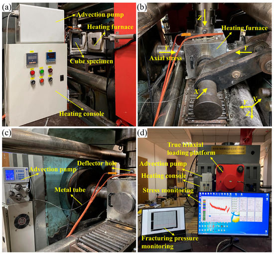 Hydraulic fracturing tests were performed on a self-developed real-time high-temperature true triaxial hydraulic fracturing platform. As shown in Figure 6, the platform consists of four systems: a heating system, a true triaxial loading system, a water injection and sealing system, and a computer monitoring system. The heating system comprises a six-sided open-hole furnace and a heating console that enables the specimen to be heated at a rate of 1–20 °C/min up to 800 °C. In the true triaxial loading system, the loading pads are inserted into the furnace wall holes to ensure that the specimen is heated and loaded to a maximum of 3000 kN in the X, Y, and Z axes, respectively. The water injection and sealing system includes a 2 PB-00IV advection pump, a metal tube, a loading pad with an internal deflector hole, and an asbestos gasket sandwiched between the specimen surface and the loading pad. The asbestos gasket serves as a seal, and the maximum working temperature is 900 °C. The advection pump allows water pressure up to 42 MPa at injection flow rates of 0.01–10 mL/min. The fracturing fluid contains a red tracer to mark the cracks after fracturing. The computer monitoring system monitors water injection pressure and loading pressure with a resolution and accuracy of 0.1 MPa and 1%, respectively. In addition, Brazilian splitting tests were conducted on a real-time high-temperature loading platform, as shown in Figure 8.