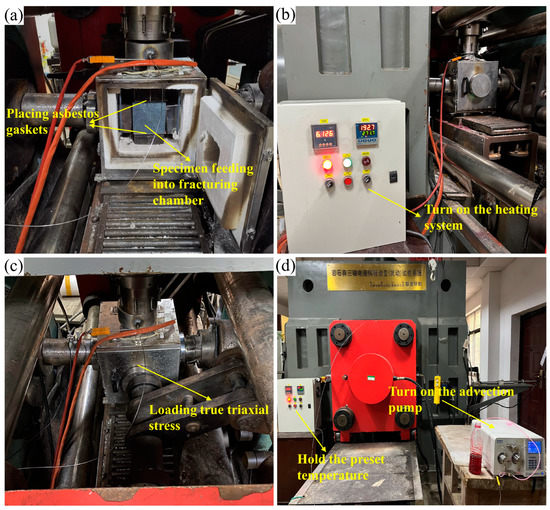 Main hydraulic fracturing procedures: (a) HFS or SFS specimen was placed in the fracturing chamber; (b) specimen was heated in the furnace; (c) three directions confining stresses were applied; (d) specimen fractured by water injection.