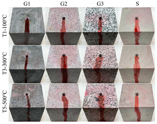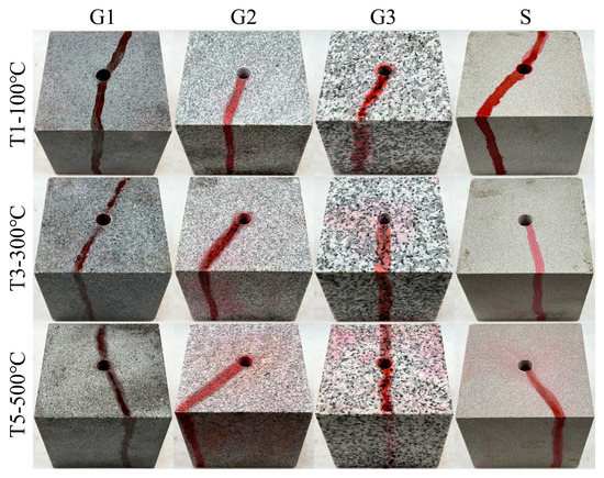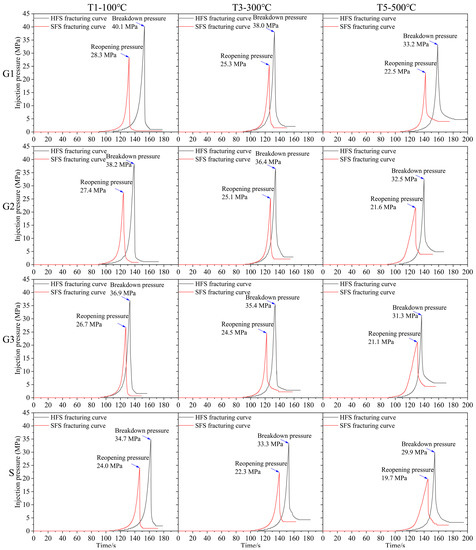 Figure 9 and Figure 10 display the photos of the HFS and SFS specimens from G1, G2, G3, and S lithologies, respectively, after being fractured. The hydraulic crack was tagged by a red tracer in the fracturing fluid. Figure 11 depicts the fracturing curves for the HFS and SFS specimens from the four lithologies. It can be seen that the fracturing curves for the HFS and SFS specimens were extremely similar, all ranging from a slow to abrupt increase and then a sharp fall after the specimen was broken. The peak points of the two types of fracturing curves represent the breakdown pressure and pre-crack reopening pressure, respectively. The breakdown pressure and reopening pressure of the HFS and SFS specimens at different temperatures are listed in Table 1 and Table 2, respectively. The data show that the specimen breakdown pressure was larger than the reopening pressure, and that both pressures decreased with increasing temperature.