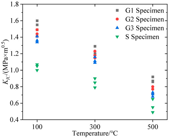 The fracture toughness calculated from the pre-crack reopening pressure and Equation (1) is listed in Table 1. As shown in Figure 12, all lithological specimens’ fracture toughness decreased with increasing temperature during hydraulic fracturing at high temperature in real-time. In each temperature group, the fracture toughness of the four lithology specimens was in the order of G1 > G2 > G3 > S.