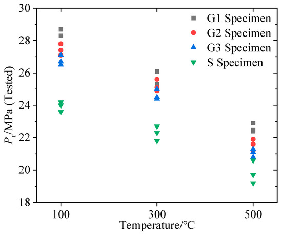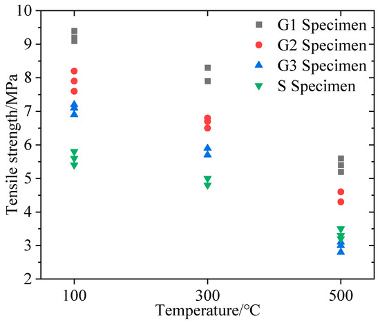 The tensile strength measurement results are listed in Table 1. As shown in Figure 13, the tensile strength of all lithological specimens decreased as the temperature rose. In each temperature group, the tensile strength of the four lithological specimens was in the order of G1 > G2 > G3 > S.