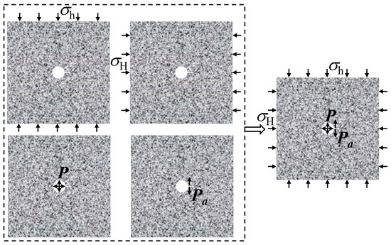 The conventional reopening pressure calculation model was originally derived from the hydraulic fracturing geo-stress measurement method proposed by Hubbert et al. [41]. The measuring method initially plugs the upper and lower ends of the measurement borehole segment and then pumps a high-pressure fluid into the strata around the borehole wall to induce a hydraulic crack. As the tensile strength is less than the shear strength and compressive strength, the hydraulic crack can be triggered when the water pressure equals the tensile strength plus the minimum shear stress of the borehole wall surrounding rock, which fulfills the following equation [42]: