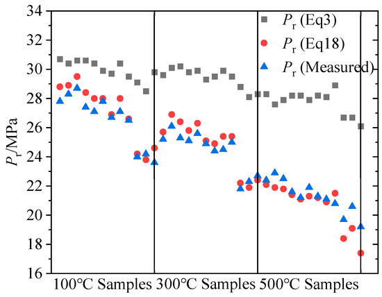 In Section 4.1, a new equation was developed for calculating the reopening pressure of a pre-crack specimen during hydraulic fracturing. To verify the accuracy of the new equation relative to the classical equation, the reopening pressure calculations of Equations (5) and (18) were compared with the measurement results, respectively.