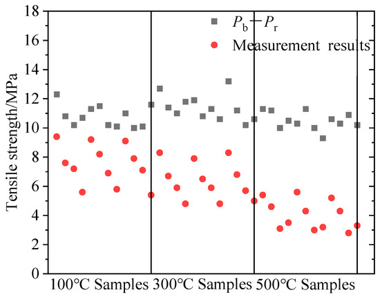 In conventional hydraulic fracturing theory, the tensile strength equals the breakdown pressure minus the reopening pressure. However, the tensile strength calculated based on the measured breakdown pressure and reopening pressure of the HFS and SFS specimens was obviously larger than the measurement results of the Brazilian splitting at high temperature in real-time, as shown in Figure 16. This discrepancy is prevalent in previous studies, indicating that the formulation based on conventional hydraulic fracturing theory is deficient.