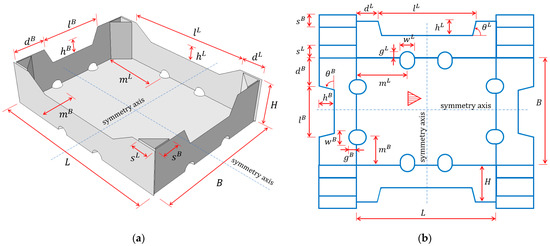 Parametric model of the open-top tray: (a) 3D view and (b) 2D scheme (for clarity, , , , , , and parameters are not shown in the first drawing).