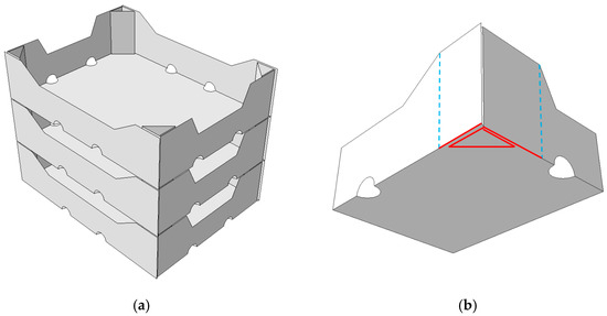 There are many types of fruit and vegetable trays on the market, depending on the specific needs and transport requirements. Despite the differences, there are some similarities, such as repetitive folds and packaging design. Manufacturers also offer their own designs, which were created based on experience, and often intuition, rather than solid analysis. A type of tray that is quite common on the packaging market was adopted for this study. Figure 1 shows the geometry of the selected tray. In these cartons, the sidewalls fold vertically and the rectangular panels form stiffening triangles. The rigidity of the corner is ensured by gluing one of the stiffening triangle walls to the longer sidewalls. Sometimes there is also a trapezoidal fold on each sidewall, which is bent down and glued to stiffen the sidewall (not shown in the drawings).