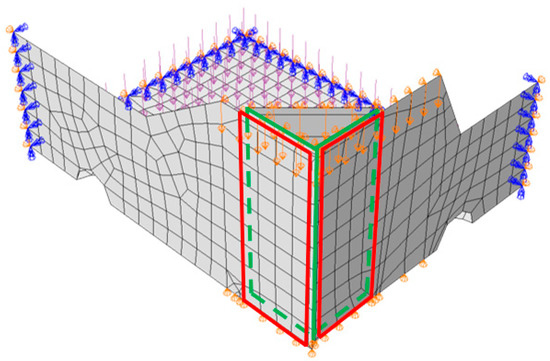 As part of the analysis, three computation steps were carried out. The first step was the buckling analysis, in which the first buckling mode was determined and then applied as geometrical imperfections to the packaging model. In the second step, the carton was supported on the edges marked in Figure 2b and loaded with a pressure simulating a 10 kg product. In the third computational step, the compression test was simulated by applying a vertical displacement to the top edges of the box. The panels of the stiffening triangle and fragments of the side walls, which are glued together in order to assemble the packaging, are also marked in red and green colors. In the FE models, it was modeled using a technique called ‘tie’, which ensures the continuity of displacements of the two connected areas.