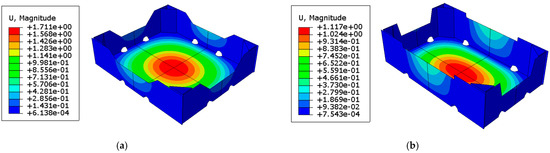 As already described in the previous section, at the beginning the buckling analysis was performed, from which the displacement distribution of each open-top carton panel was obtained. Then, the displacement maps were applied as initial imperfections and the bottom of the box was loaded with pressure simulating the stored goods. Figure 4 shows the displacements after the second computational step for two selected cases.