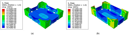Distribution of effective Huber–Mises–Hencky stresses at the moment of reaching the maximum strength of the fruit tray: (a) case 19 and (b) case 20.