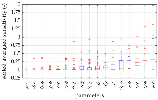 If one looks at the results for all geometries separately, it can be seen that for some parameters the sensitivity of the model is very high, while the average value remains low. This situation occurs mainly for the parameters , , , , , , , and , when the perturbation of these parameters interferes with the load-bearing zone. In Figure 6, it can be clearly seen that in many cases the average value (or median) of the model’s sensitivity to individual parameters is close to zero, and some outliers oscillate around 1 or 2. This means that one should be very careful in the process of designing the tray, because some combinations of geometrical parameters that usually do not have a great impact on the performance of the package, can play a key or at least a significant role.