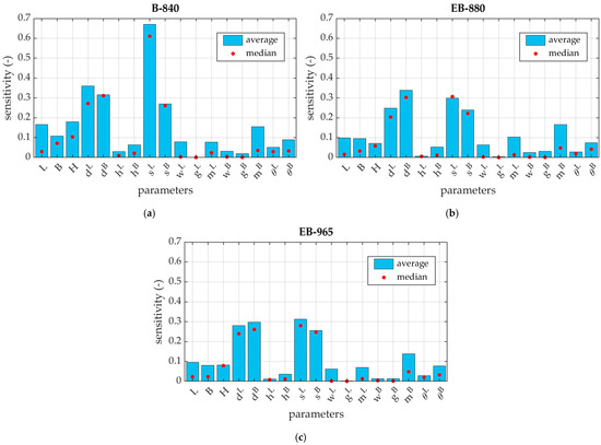 Average and median sensitivities for 17 analyzed parameters for three different cardboards: (a) B-840, (b) EB-880, and (c) EB-965.