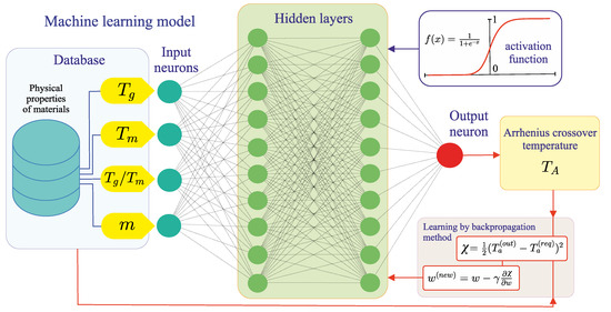 which determines the relationship of a parameter y with the parameters , ,… ,… In the obtained model of the artificial neural network, the appearance of the parameter , together with the individual parameters and , directly indicates that the Arrhenius crossover temperature correlates not only with the absolute values of the melting and glass transition temperatures for different systems, but also with their ratio. This result is fully consistent with the theoretical description of crystallization rate characteristics of supercooled melts within the reduced temperature scale and universal scaled relations [9,30]. This point is discussed in detail in Ref. [30] (see text on page 104502-2).